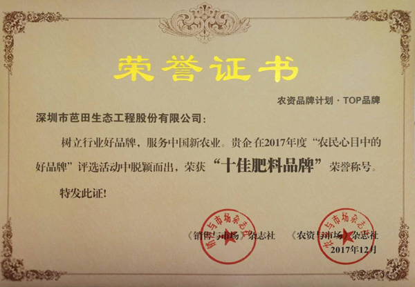 “大国重器,粮安天下,中国肥料的脊梁,用品质、科技和服务来博弈天下,守护粮食安全。荣耀时刻,见证肥料领军品牌的力量”。2017年12月18日,第二十届中国农化品牌营销峰会在北京隆重召开,芭田股份被评为2017年度农民心目中的好品牌之“十佳肥料品牌”。